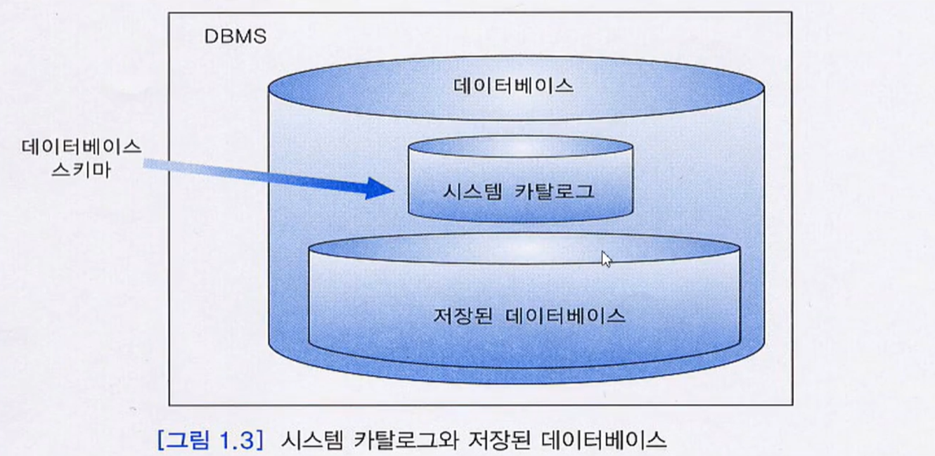 - 시스템 카탈로그 (or 데이터 사전, Data Dictionary) 와 저장된 데이터 베이스로 구분 할 수 있다.