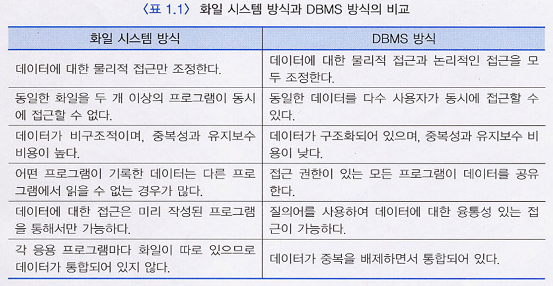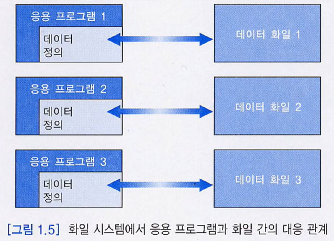 파일 시스템 에는 레코드만 가진 파일 형태로 존재하지만 관계형 데이터베이스는 속성, 튜플을 가진 릴레이션(테이블) 형태로 존재합니다.